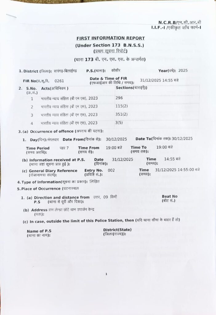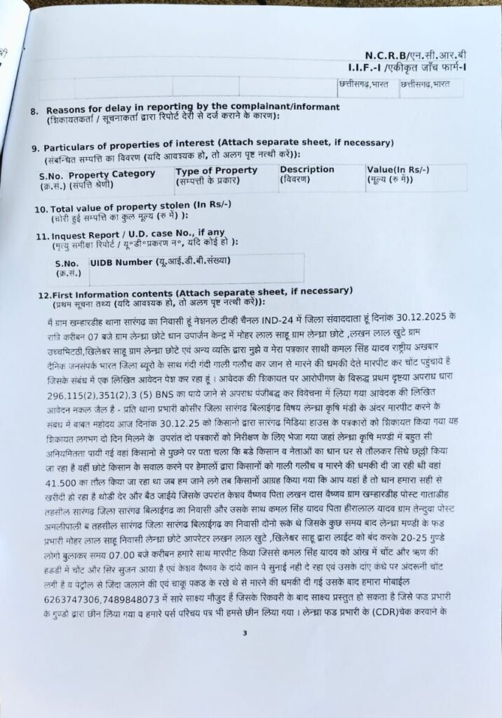 सारंगढ़ – बिलाईगढ़ – धान खरीदी केंद्र लेंधरा (छोटे) में पत्रकारों पर जानलेवा हमला..किसानों की शिकायत पर न्यूज़ कवरेज करने गये थे पत्रकार..लाइट, सीसीटीवी बंद कर फड़प्रभारी सहित अन्य नाकाबपोशों ने किया जानलेवा हमला..मोबाइल पर्स आईडी लुटे…पत्रकारों पर नहीं बल्कि लोकतंत्र औऱ संविधान पर हमला – जनता पत्रकारों ने कोसीर थाना मे कराया अपराध दर्ज..