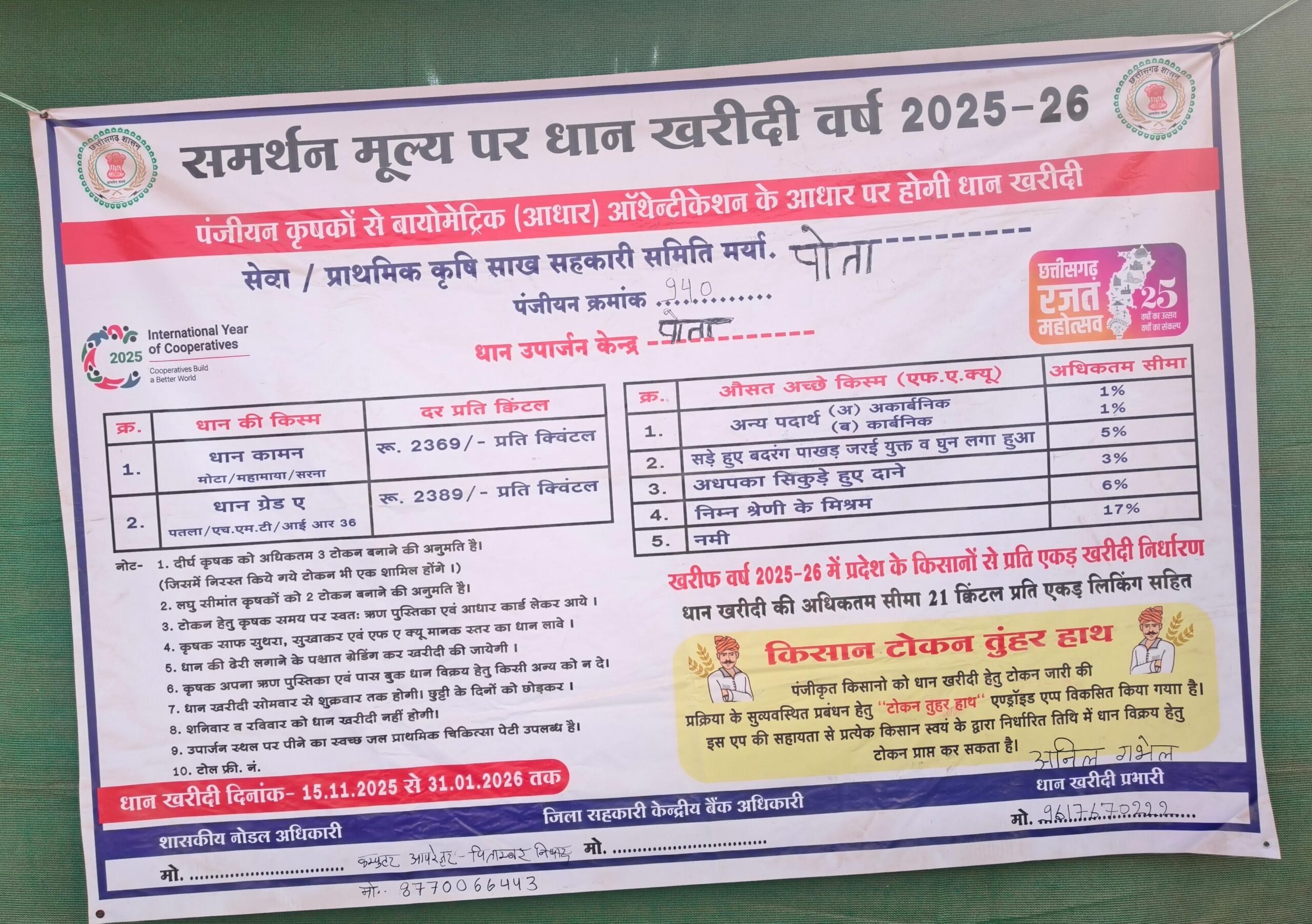 खरीदी केंद्र पोता में सत्र 2025-26 में कुल 615 किसानों से 31412.80 क्विंटल सरना और 17575.60 क्विंटल मोटा कुल 48988.40 क्विंटल धान की खरीदी हुई हमने मौके में जा कर किसानों से बात किया किसान राजेन्द्र गभेल , तीरथ गवेल , रवि शंकर गभेल , तारकेश्वर गवेल , सूरज गभेल , शांतिलाल गवेल , श्याम मनोहर गवेल , साहेबलाल गभेल ,राधे लाल चंद्रा , हरि चंद्रा, जीवन चंद्रा, प्रहलाद चंद्रा, नितिन गभेल, गौरी शंकर , देवी चंद्रा,सुरेश गवेल,मुन्ना गभेल,राजेश ,विवेक गभेल , असामी लाल गवेल ,ओम प्रकाश , मोतीलाल गवेल अन्य किसानों से बात किया सबने बताया इस साल की धान खरीदी से खरीदी प्रभारी अनिल गभेल के कार्य से सब पूर्ण रूप से संतुस्ट है सब किसानों ने अनिल गभेल को खरीदी केन्द्र पोता में खरीदी प्रभारी नियुक्त करने के लिए बहुत बहुत आभार ब्यक्त किया